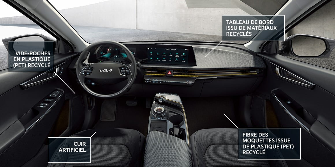 L’EV6 prend ses responsabilités en proposant des rangements de portes et des tapis de sol en plastique recyclé, ainsi que des sièges en cuir végan en option.