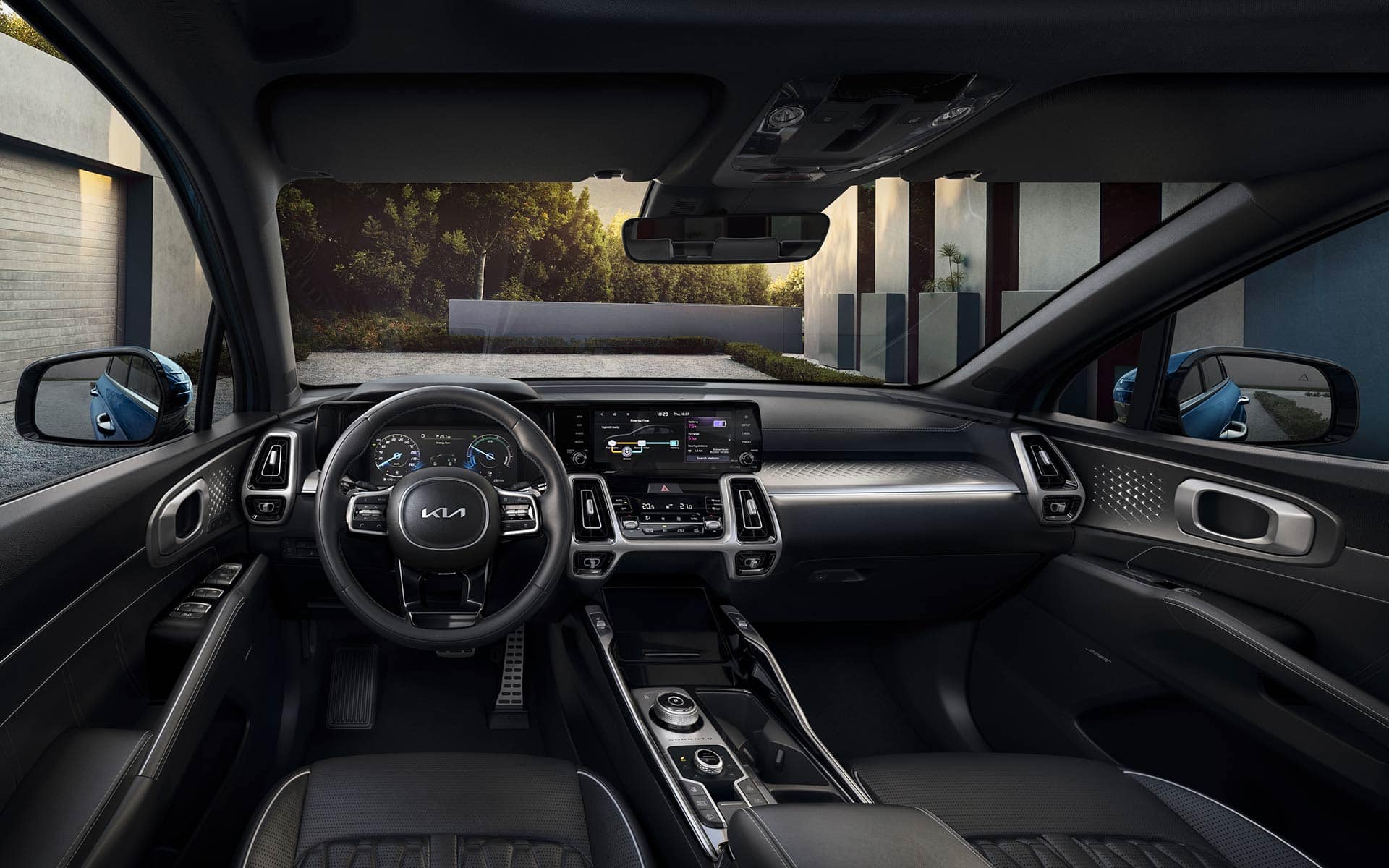 De l'avant du nouveau Sorento émane une présence musclée qui se caractérise par une imposante calandre sculptée esthétiquement encadrée de chrome et de noir brillant, un bouclier au look sportif de la couleur de la carrosserie avec une grille d’aspiration à la forme ailée et une plaque de protection avant élégante en argenté.